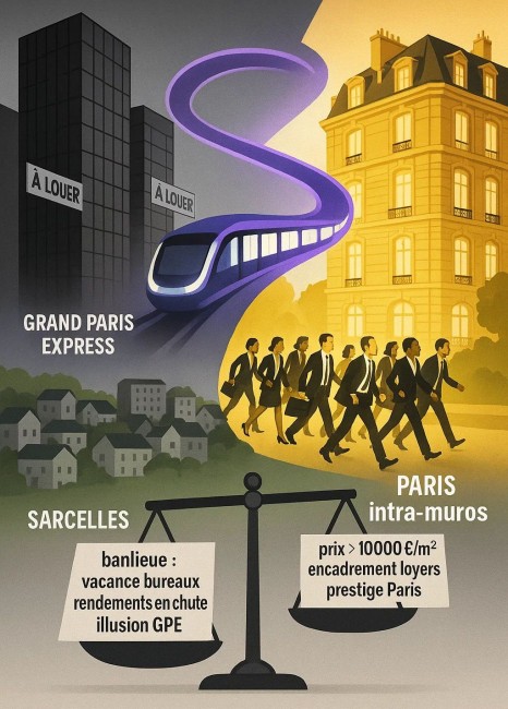 La grande illusion du Grand Paris Express : On pensait qu'il valoriserait la banlieue. Il facilite surtout l'accès à Paris, renforçant paradoxalement sa centralité. Et Paris, malgré son inaccessibilité croissante (>10 000 €/m²), continuera probablement à grimper car l'offre se raréfie (encadrement loyers) tandis que la demande s'intensifie (retour des entreprises).