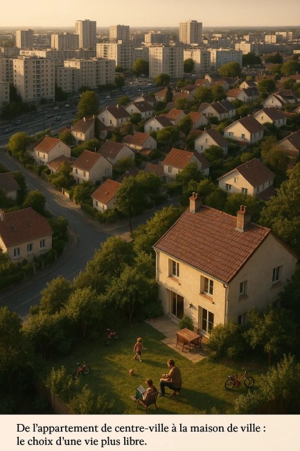 Sauf que non. Une maison de ville 100 m² dans une commune à 15-20 km du centre-ville du 95 coûte souvent moins cher que le petit T3 urbain. Et vous n'avez plus les charges mensuelles (200-300 € par mois) qui érodent votre budget.